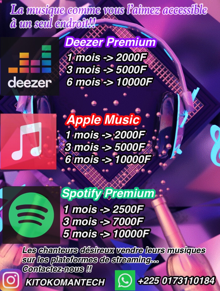 Profitez de tous vos abonnements aux plateformes de streaming de Musique à des prix abordables…🫠
